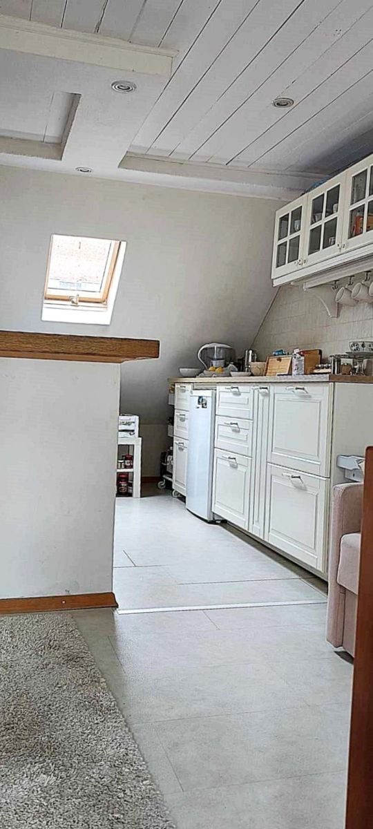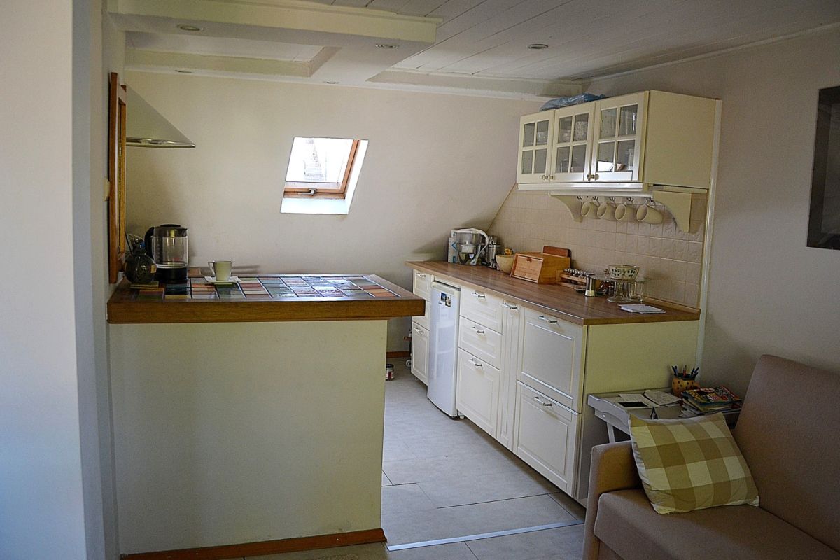 - Piętro: salonik z aneksem kuchennym, sypialnia, łazienka