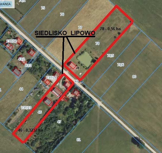 działka 78 - 0,56 ha - na działce znajduje się duży, wysoki garaż oraz staw